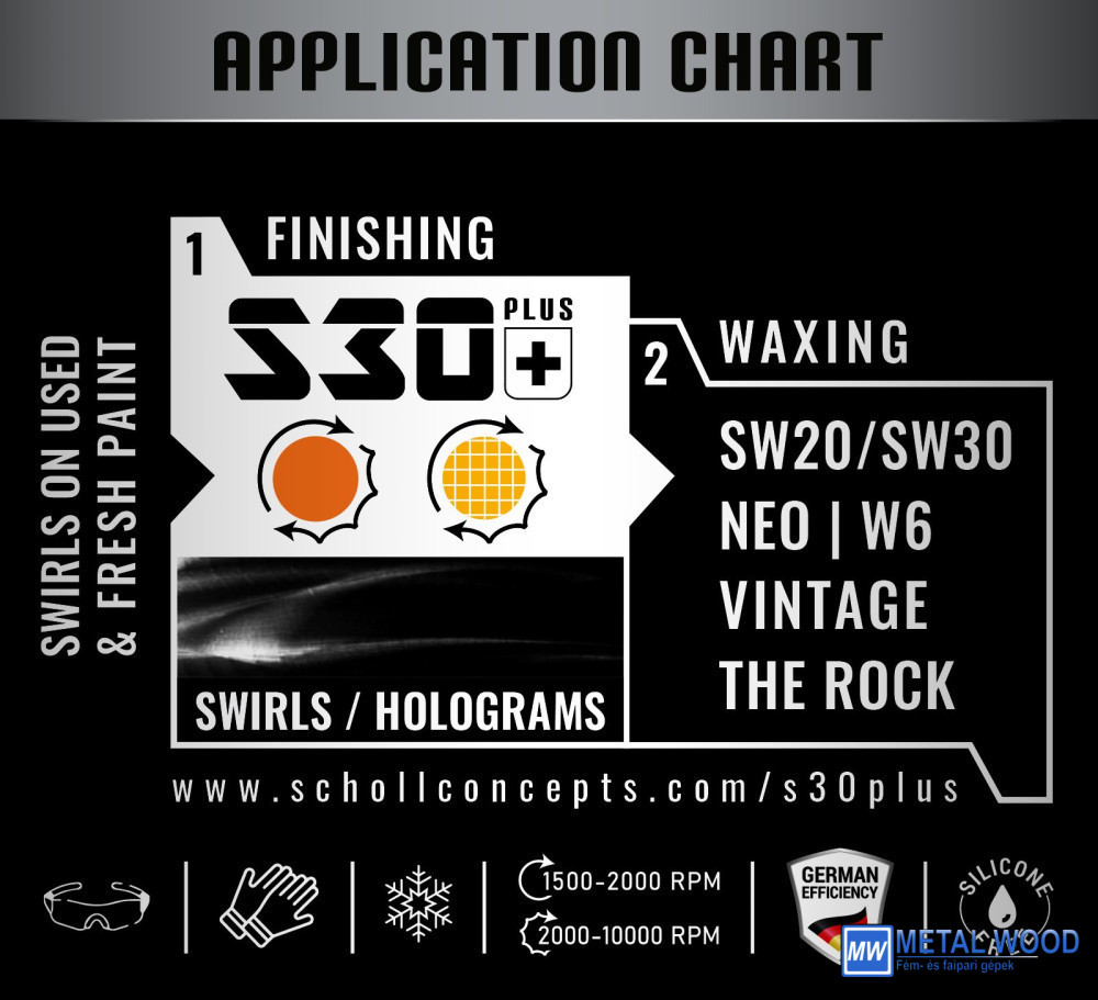 Az S30+ paszta alapvetően szinte az összes SCHOLL polírozó párnával feldolgozható.