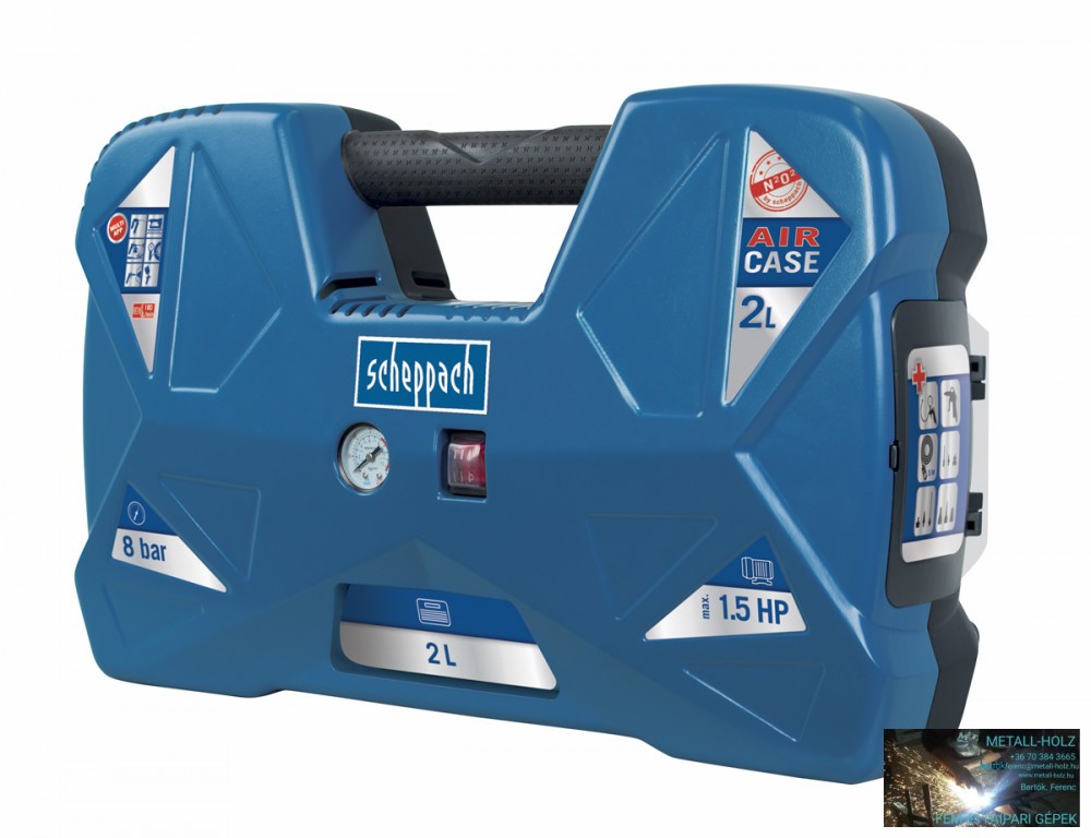 Az AIR CASE kicsi, helytakarékos, csendes, könnyű, de ennek ellenére erős és gazdagon felszerelt kitűnő kompresszor. Kiváló segítség nyújt minden háztartásban, hétvégi házban, lakókocsiban vagy kiesebb műhelyben. A standardon felüli tartozékok tartalmazzák a 2 l-s levegőtartályt, amelynek segítségével elektromos áram nélkül is felfújhatja a kerékpárját a pincében, a 9 különböző csatlakozó segítségével felfújhatja a labdákat, gumikerekeket, matracokat, vagy akár a felfújható medencét is. Tartalmazza továbbá a 3 m hosszú nagynyomású tömlőt integrált manométerrel és nyomásszabályozóval, valamint a praktikus fúvópisztolyt, a tartozékok integrált tárolási lehetőségét, a kényelmes fogantyút és a tartály nyomásmérő manométerét is. A kompresszor a legmodernebb olajmentes technológiával készült motorral van felszerelve. Az olajszint ellenőrzése, utánpótlása vagy cseréje teljesen szükségtelen, és a kompresszor így is mindig készen áll a munkára. A mérete, és összesen 8 kg súlya miatt használata ideális a kempingezéshez vagy más szabadtéri tevékenységekhez.