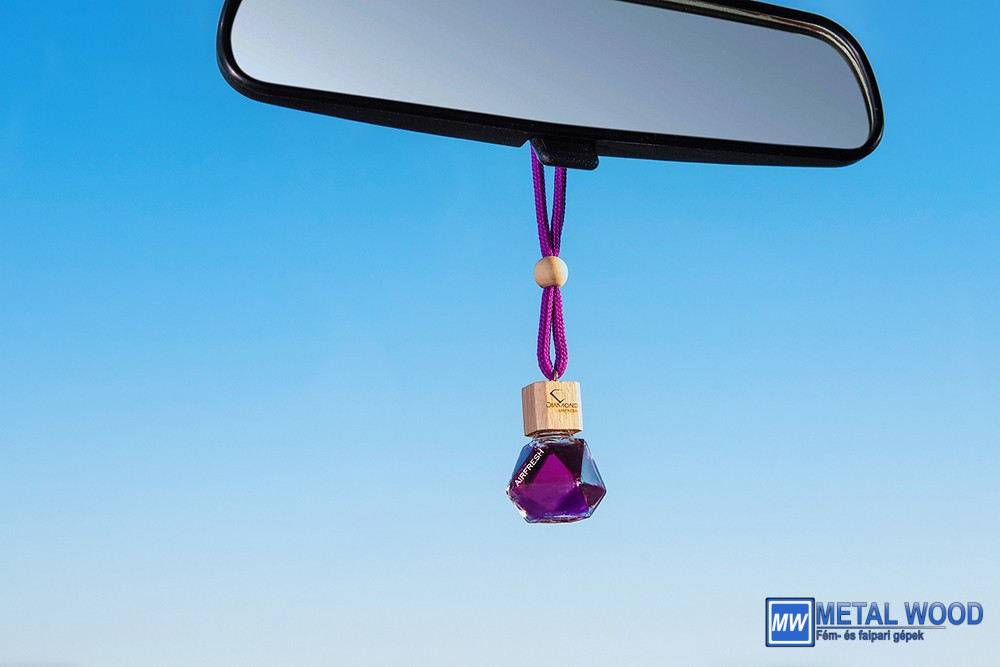 Az üveg eredeti, kúp alakú formája és a palack üvegén keresztül látható illatkompozíció diszkrét, esztétikus kiegészítővé teszi a terméket, amely az autó belsejét díszíti.