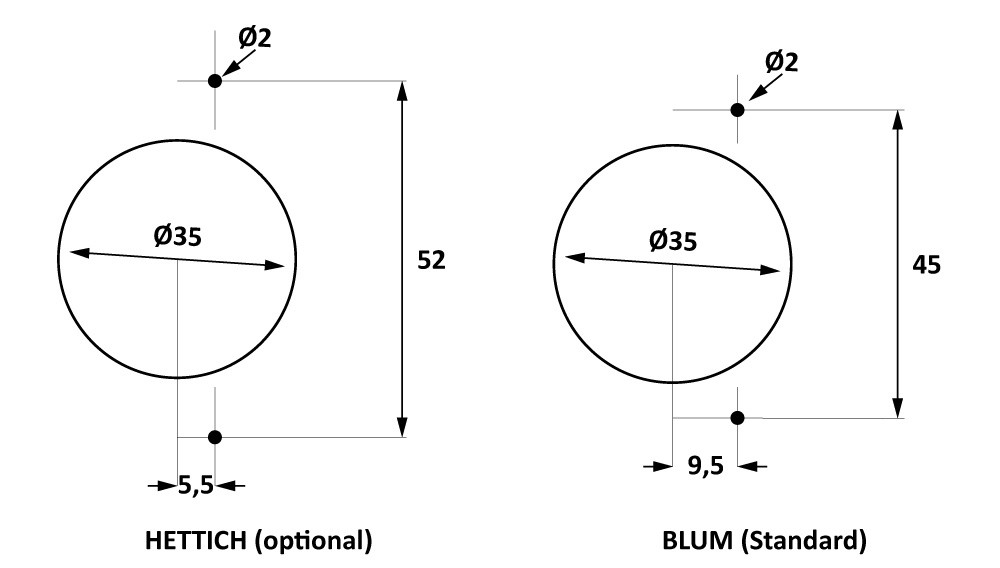 Blum fúrási minta, átalakítás Hettich fúrási mintához opcionális Hettich fejjel lehetséges.