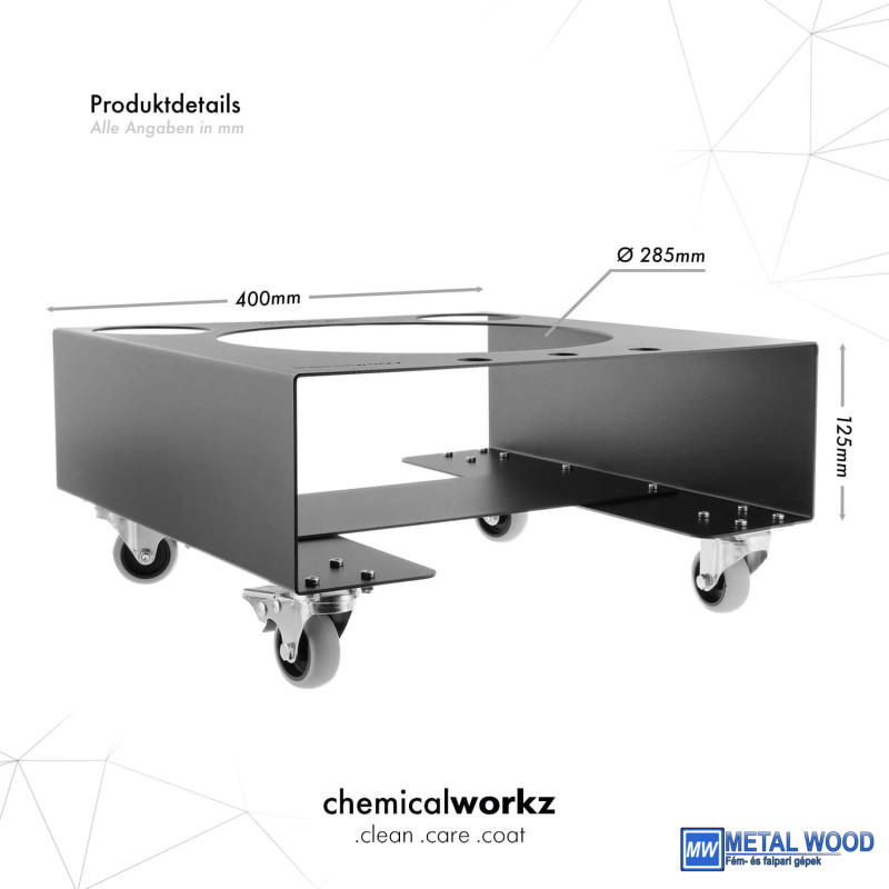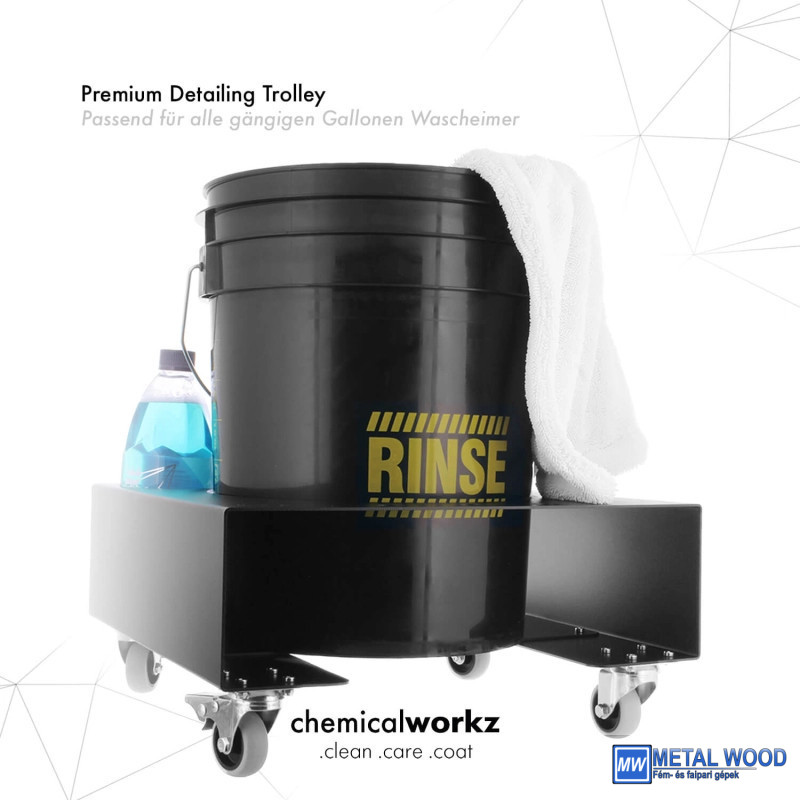 A ChemicalWorkz Vödör kocsi tökéletes az autó mosására, nagymértékben növeli a munkakényelmet és szükségtelenné teszi a nehéz vödör szállítását. A kocsi kiváló minőségű horganyzott 2 mm-es acéllemezből készül, végül porfesték védőréteggel van bevonva. A kocsi kétségtelen előnye a speciálisan kialakított lyukak a vegyszeres palackok és a 3 kefe tárolására.
