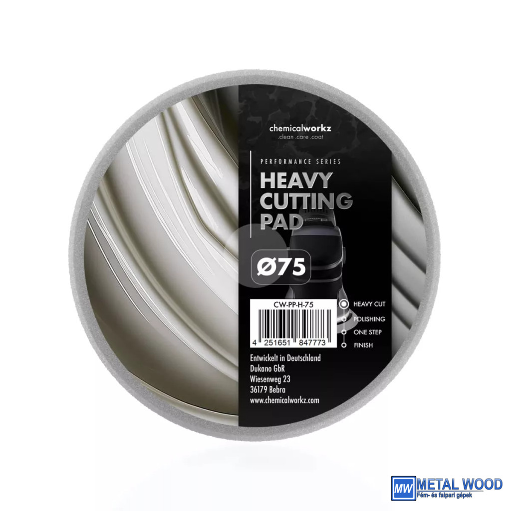A legjobb eredmény érdekében javasoljuk a Chemicalworkz Heavy Cutting Performance Pad használatát nagy teljesítményű csiszolófényezőkkel kombinálva. Ideális egy többlépcsős polírozási folyamat első szakaszában, vagy hatékony eszköz a további hibák javításához gyapjú vagy mikroszálas polírozó párnák használata után.