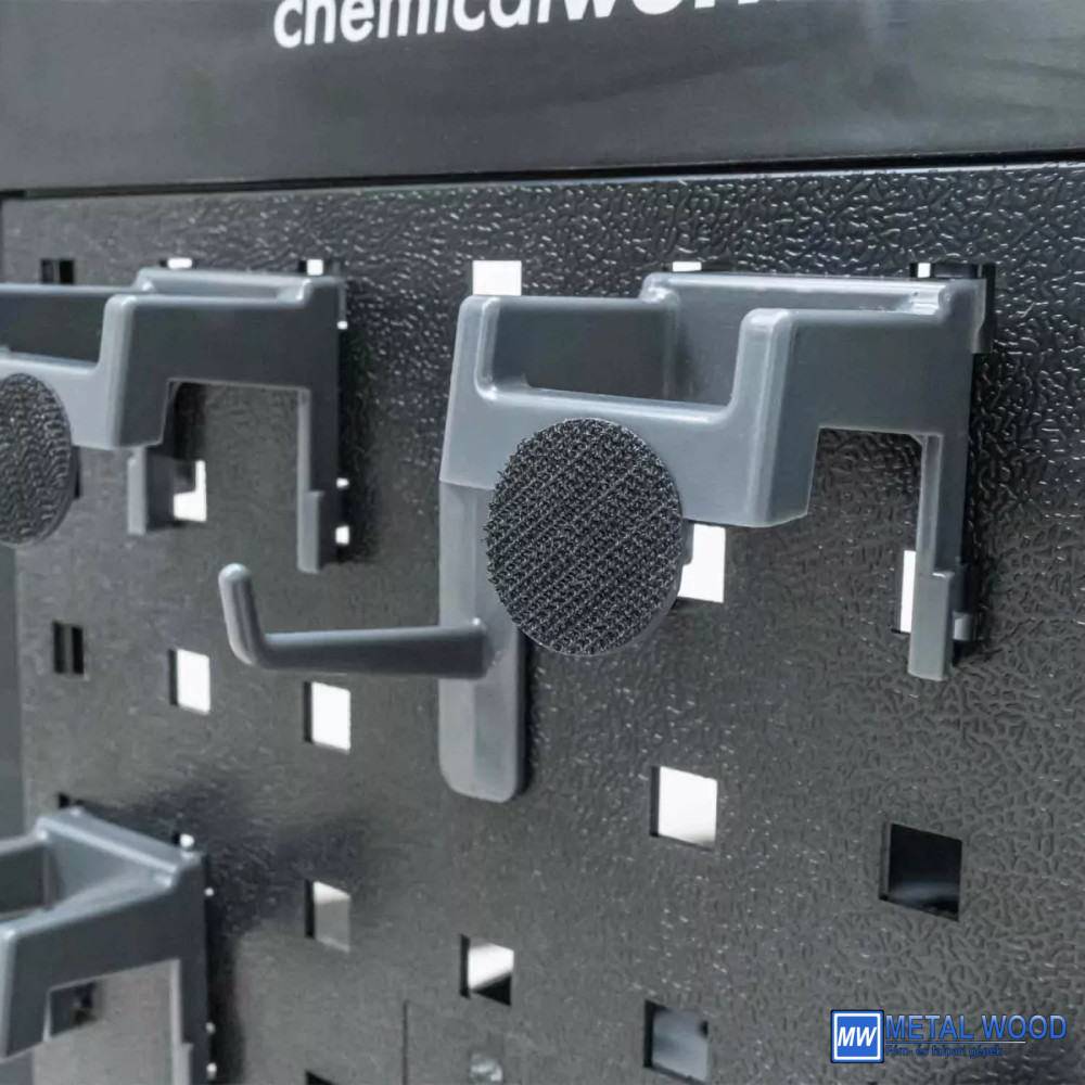 Különösen ötletes a pegboard oldalpanel kialakítása, amely két perforált műanyag tartólapból áll, és személyre szabható a mellékelt horgokkal/kosárral. Ez a kialakítás további lehetőségeket biztosít az eszközök rendszerezésére és tárolására. Új kiegészítő tartók állnak rendelkezésre a polírozó párnák rögzítéséhez tépőzárral vagy oldalra lógó palackokkal. A nagy tárolókosár is jól átgondolt, gyakorlatilag minden típusú szerszámhoz használható, beleértve a mikroszálas törlőkendőket is. A Chemicalworkz Detailing Trolley masszív műanyag lábai könnyen felszerelhetők, és stabilitást és sokoldalúságot biztosítanak.