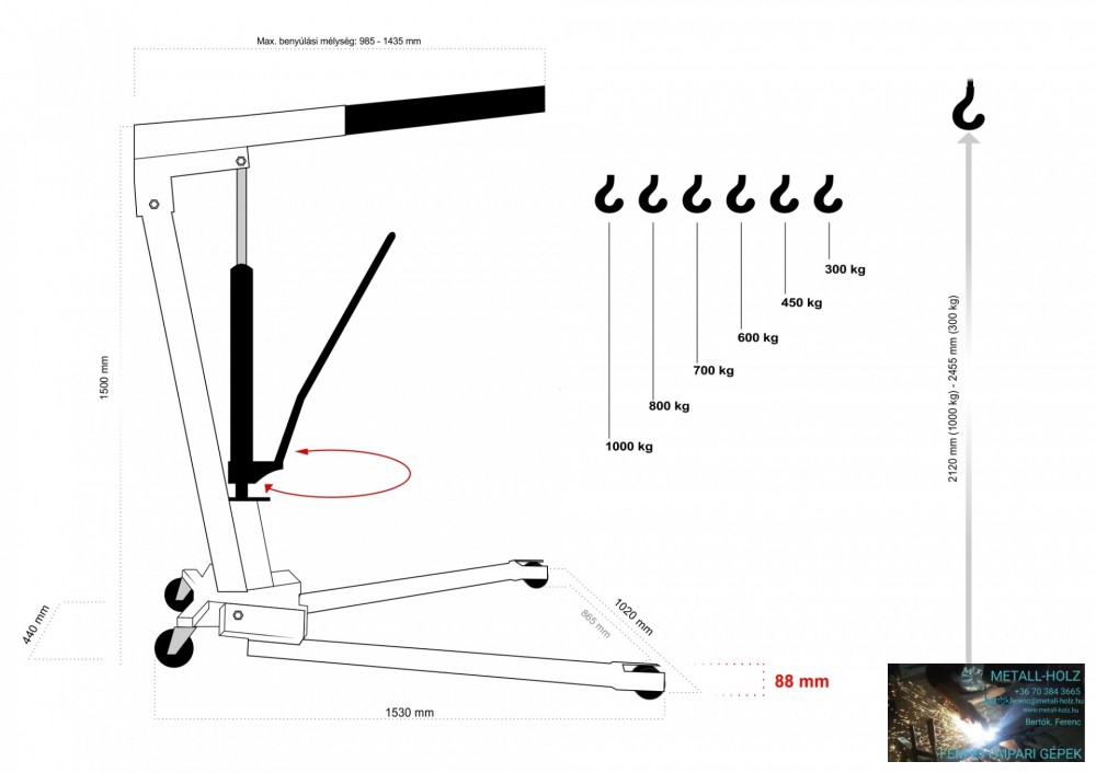 Emelési magasság tartománya: 2120 mm (1000 kg) – 2455 mm (300 kg)