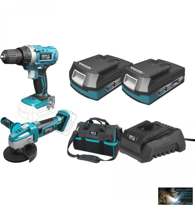 Dedra akkumulátoros sarokcsiszoló + fúró-csavarozó 18 V készlet (akku + töltő + táska) + ajándék pótakkumulátor