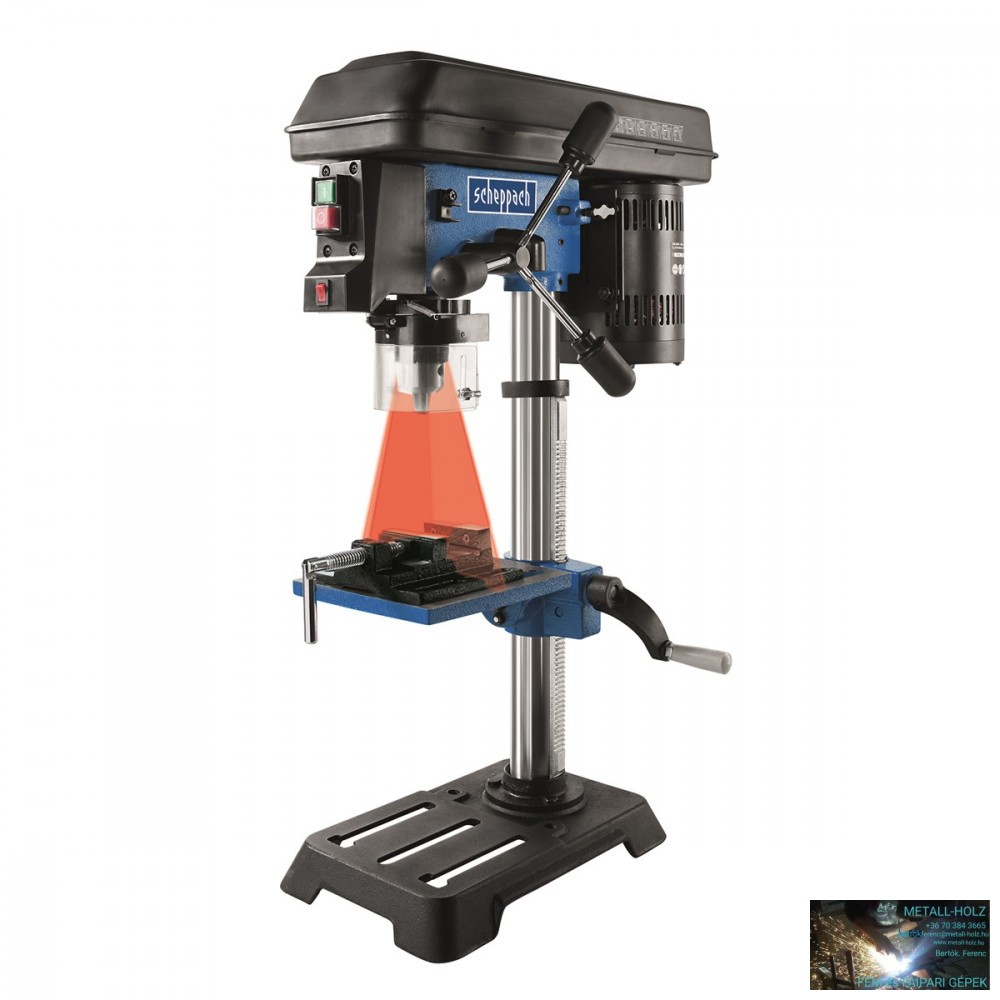 A Scheppach DP 16 SL kiválóan felszerelt, állványos fúrógép az igényes barkácsolók és műhelyek számára. Az alapvető különbség a többi hasonló géphez képest a központosító lézerfény kivetítésének lehetősége, amely előjelöli a fúrás pontos helyét, megkönnyíti azt, így felgyorsítja a nagyobb darabszámú munkadarabok megmunkálási idejét. A gép masszív, öntvényből készült konstrukcióval rendelkezik, standard felszerelései közé tartozik a 16 mm-s fúrótokmány, ötfokozatú sebesség beállításának lehetősége a kemény és puhafa, a fém és a műanyagok megmunkálásához, a leszerelhető satu és az erős 550 W-os motor, amely megbirkózik szinte minden anyaggal. A gép természetesen megfelel az Európai Unió legújabb biztonsági követelményeinek, mint például a gép elején elhelyezett főkapcsoló, az áttetsző tokmányvédő megléte és hasonlók. A gép stabil állványon van elhelyezve, és csavarok segítségével rögzíthető a munkaasztalhoz vagy a padozathoz is.