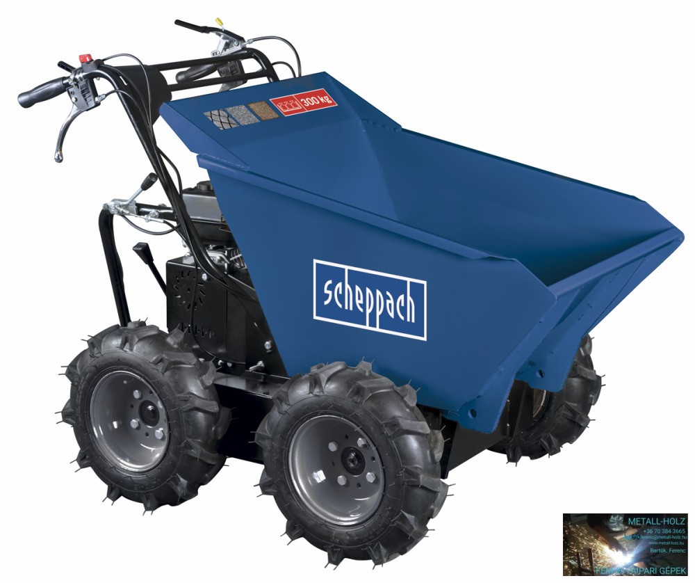 A Scheppach DP 3000 kerekes anyagszállító, nagyon kényelmes szállítási lehetőséget biztosít, akár 300 kg súlyú ömlesztett és szilárd anyagok áthelyezésére, még a nehezebben hozzáférhető helyeken is. Tökéletesen szállítható vele a föld, a homok, a kavics, a kő, a térburkolat, a tégla, de akár a fa és fű is. Széles körben használják az építkezéseknél, a bontási és felújítási munkáknál, az alapozásoknál, a mezőgazdaságban, a kertészetekben, az erdészetekben, stb. Előnye nemcsak a nagyobb biztonság és mozgathatósága a nehezebb terepen is, hanem az elvégzett munka nagyobb hatékonysága a hagyományos manuális szállítóeszközökhöz képest. A négy kerék meghajtás biztosítja a gép kiváló mozgását a nehezebb terepviszonyok között is, továbbá a nagy és széles kerekek elősegítik a gép könnyű kezelhetőségét és a gép alvázvédelmét. A gépet nagyon egyszerűen lehet kezelni. A vezetőkaron lévő fogantyúval könnyen szabályozható a menetirány, a fék automatikusan aktiválódik a kuplungkar felengedésével és a sebességváltókar is elérhető közelségben van a kezelő személy számára. A gép meghajtását a nagyon közkedvelt Loncin motor biztosítja 6,5 LE teljesítményével, amely a legnépszerűbb és legmegbízhatóbb motorok közé tartozik. A gépet 100 x 50 cm-es hólapáttal is ki lehet egészíteni.