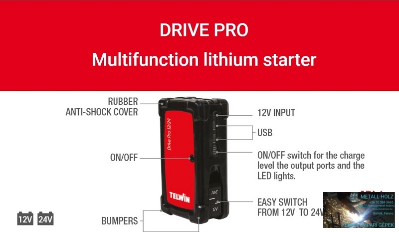 A Drive Pro 12/24 egy professzionális, hordozható bikázó és power bank egyben. Használható 12 vagy 24 V-os motorokhoz is, motorkerékpárok, személyautók, kisteherautók motorjainak indításához, ha az akkumulátorfeszültség már nem elegendő az indítómotor megforgatásához.