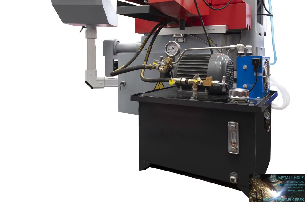 Hidraulikus hosszirányú előtolás állítható karral és kapcsolási pozíciók állíthatók végálláskapcsolóval (villanymotor 1,5kW szivattyúhoz) 7-23m / perc