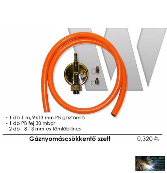 Gáznyomásszabályzó fej PB 30mbar+kiegészítő szett (1m tömlő+bilincsek)