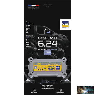 A GYSFLASH 6.24 kifejezetten motorok, autók, gyűjteményautók, haszongépjárművek 6, 12 és 24V-os akkumulátorának töltésére lett kifejlesztve. 7 lépéses, intelligens töltési görbével rendelkezik, valamint egy töltési opcióval a kis akkumulátorokhoz 15 Ah-ig.