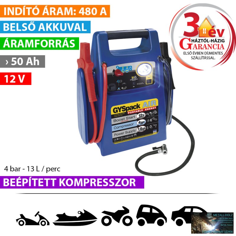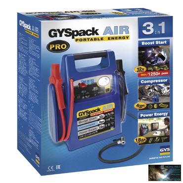 – Ha lemerült az akkumulátor : a GYSPACK AIR azonnal indítja a benzines vagy diesel nehéz gépjárműveket, lakókocsikat, furgonokat (indítóáram 480A, csúcsáram 1250A).