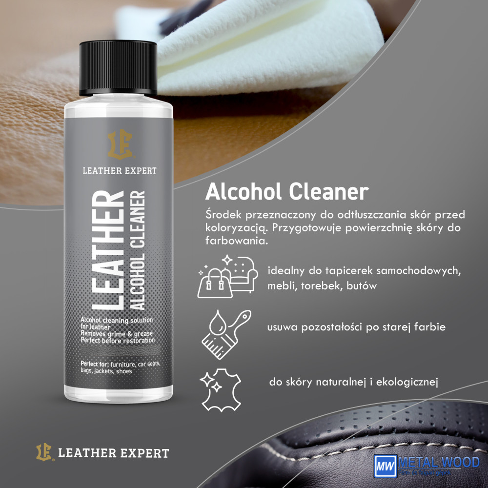 Leather Alcohol Cleaner – bőr festés előtti zsírtalanítására szolgáló szer. Eltávolítja a Leather Preparer maradékait. Ezenkívül eltávolítja a viaszokat és az olajokat a bőr felszínéről. Pontosan felkészíti a bőrt a színező kezelésre.