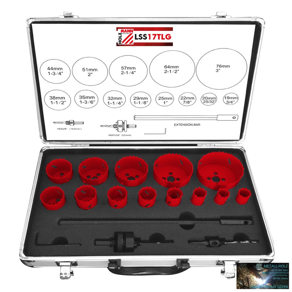 - HSS lyukas fűrészkészlet 19 mm, 20 mm, 22 mm, 25 mm, 29 mm, 32 mm, 35 mm, 38 mm, 44 mm, 51 mm, 57 mm, 64 mm, 76 mm