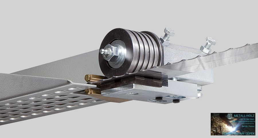 A hatalmas szalagfűrészt az állítható kemény krómozott oszlopok (felfelé és lefelé történő mozgatáshoz) tartják, amelyek a szalagfűrész keret mozgásának abszolút pontosságot és gyakorlatilag korlátlan élettartamot biztosítanak, ha a gépet rendszeresen kenik. A kar függőleges mozgását kétoldalas szinkron láncátvitel biztosítja váltóval felszerelt motorral. A központi vezérlő panelen két sebesség fokozat állítható – gyors előtolás és lassú előtolás a pontos pozícióhoz -. Ez a rendszer mindig kiegészíthető opcionálisan elektronikus mérőeszközzel, amely automatikusan a megadott helyzetbe állítható. A keret kiváló minőségű szürkeöntvényből készült, amelyek kiegyensúlyozott a rezgések ellen. A kerék kerületén horony van. A horonyban cserélhető gumi-textil öv van, amely optimális érintkezési felületet teremt a kerék és a fűrészlap között. A feszítőkerék-rendszer egy erős, öntöttvas ékvezető mentén mozog, állítható nyomástartóval, amely lehetővé teszi a rendkívül pontos beállítást, szabad mozgás nélkül, még a gép hosszú távú üzemeltetésekor is. A fűrészlapot a vágáshoz edzett tárcsák vezetik. Ez a rendszer minden irányba teljesen beállítható, és biztosítja a vezetőgörgők és a fűrészszalag optimális helyzetét.