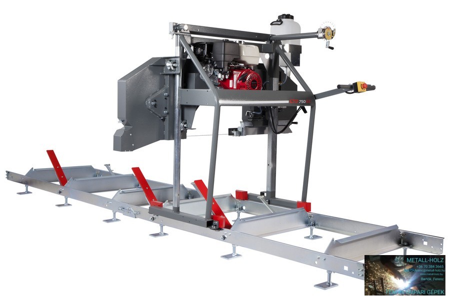 A gép teljes teljesítményét megbízható HONDA motor adja és ez garantálja az alacsony üzemeltetési költségeket és a könnyű használatot mostoha körülmények között is. Használhat akár szélesebb 35 x 0,9 mm-es bimetall fűrészszalagot is a 27 x 0,9 mm-es fűrészszalag helyett. Ez a fémipari bimetall fűrészszalaghoz hasonlóan nem igényel semmiféle élezést vagy foghajtogatást. A gépet szabványos favágó szalagokkal is felszerelheti, amelyek megegyeznek a magasabb szintű profi modellekkel. Ezekben a fűrészszalagokban a nagyobb fogak lehetővé teszik a termelékenység növelését nagy átmérőjű rönk vágásakor. A keret alumínium öntvény idler-kerekekkel van ellátva, amelyek kiegyensúlyozzák a rezgéseket. A kerék kerületén horony van. A horonyban cserélhető gumi-textil öv van, amely optimális érintkezési felületet teremt a kerék és a fűrészszalag között.