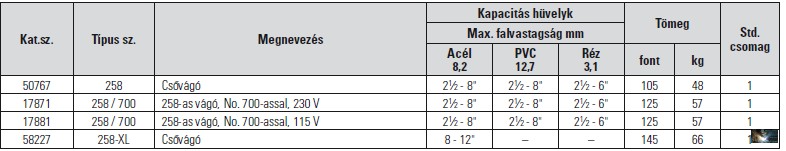 • Vágási kapacitás: 258XL modell: 8″ (200 mm) – 12″ (300 mm). ütemezés 10*/40 acél cső.