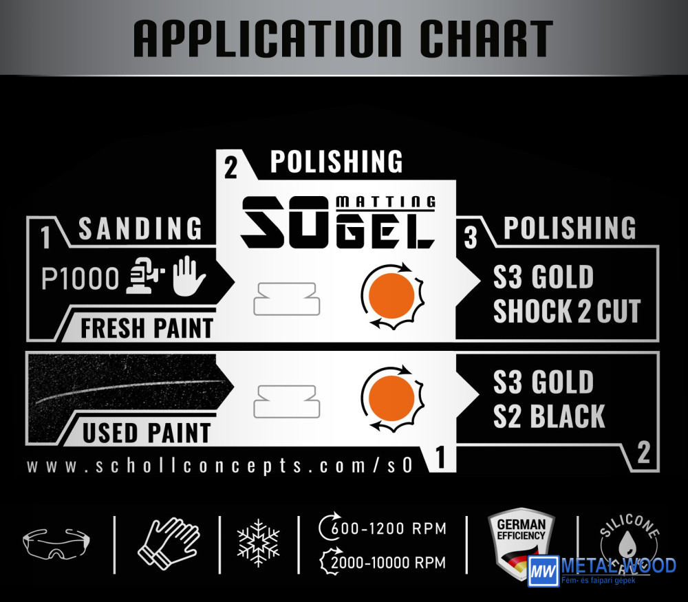 A géppel feldolgozott S0 drasztikusan csökkenti a túl durván csiszolt festékfelületek érdességét, és szükségtelenné teszi a drága „puha csiszolókorongok” használatát. A gépi megmunkálás teljesen egyenletes matt felületet hoz létre, amely azután másodpercek alatt fényesre polírozható az S3 Gold erős csiszolópasztával. Még a mély karcolások is biztonságosan eltávolíthatók csiszolópapír vagy puha csiszolókorong használata nélkül.