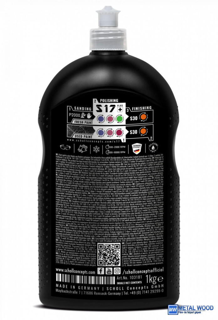Az univerzális, nagy teljesítményű S17+ csiszolópaszta friss fényezésre, valamint karcok eltávolítására használható a használt és az időjárás viszontagságos fényezésén. Az intelligens portechnológia (iPT) maximális eltávolítást (vágást) és tökéletes magasfényt biztosít minimális porképződés mellett. A P2000-es és finomabb szemcsés csiszolási nyomok könnyen eltávolíthatók. Ideálisan alkalmas karcálló átlátszó bevonatrendszerekhez.