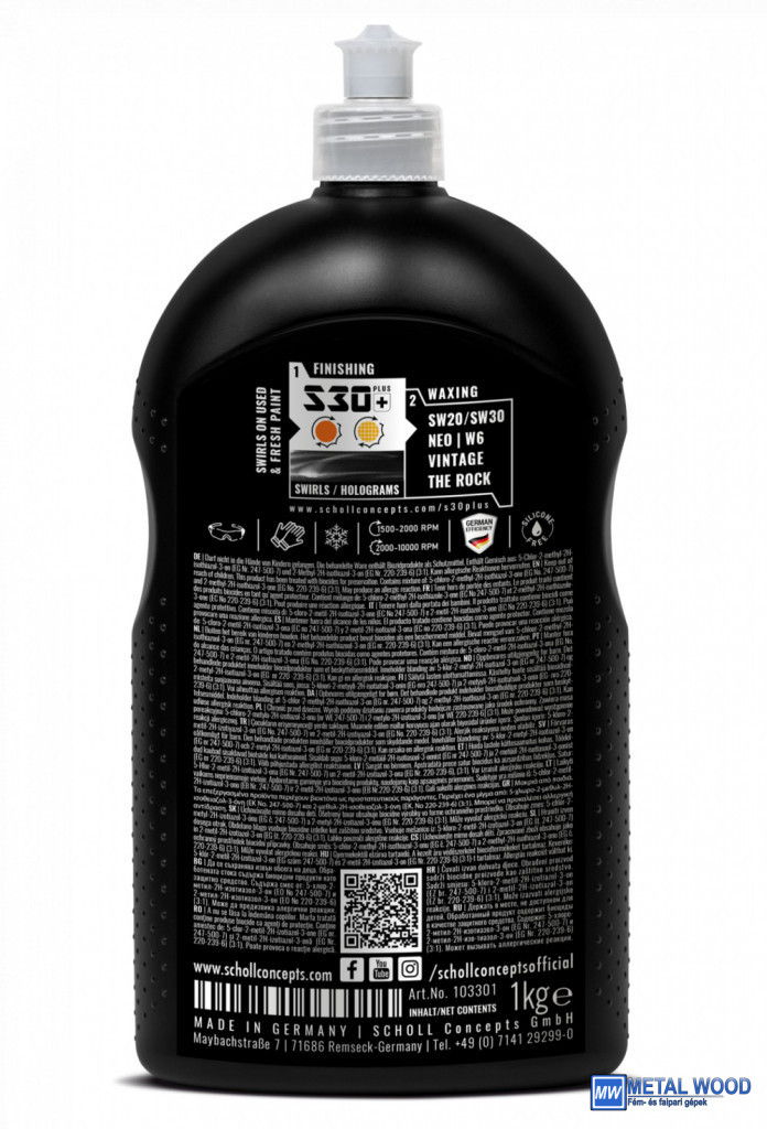 A High Performance Compound S30+ tökéletes végeredményt garantál sötét fényezésen. A mikrofinomságú, nagy tisztaságú alumínium-oxid poron alapuló egyedi összetételnek köszönhetően a fedőbevonat enyhe karcolásai és mérsékelt kopásnyomai, valamint a korábbi polírozási alkalmazásokból származó örvénylési nyomok és hologramok könnyen eltávolíthatók. hatékonyan egyetlen lépésben.