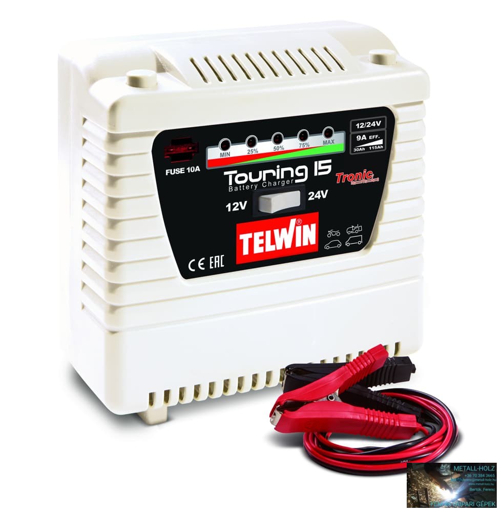 A Touring 15 hagyományos transzformátoros akkumulátor töltő 12V és 24V-os akkumulátorokhoz, elektronikusan szabályozott töltési fázisokkal.