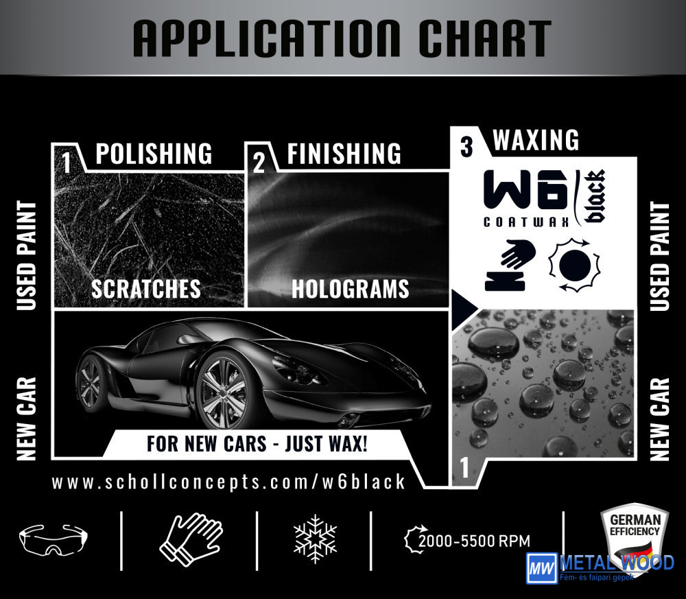 A W6 Black felhordása előtt a felület hőmérséklete nem haladhatja meg a 30°C-ot, és legyen száraz és pormentes. A kézi felhordás a legjobban a könnyen kezelhető, fekete felhordókoronggal valósítható meg finom körkörös mozdulatokkal. Az orbitális polírozógépekkel végzett gépi megmunkáláshoz javasoljuk, hogy a W6 Black prémium tömítést alkalmazza a SOFTouch WAFFLE PAD BLACK termékünkkel.