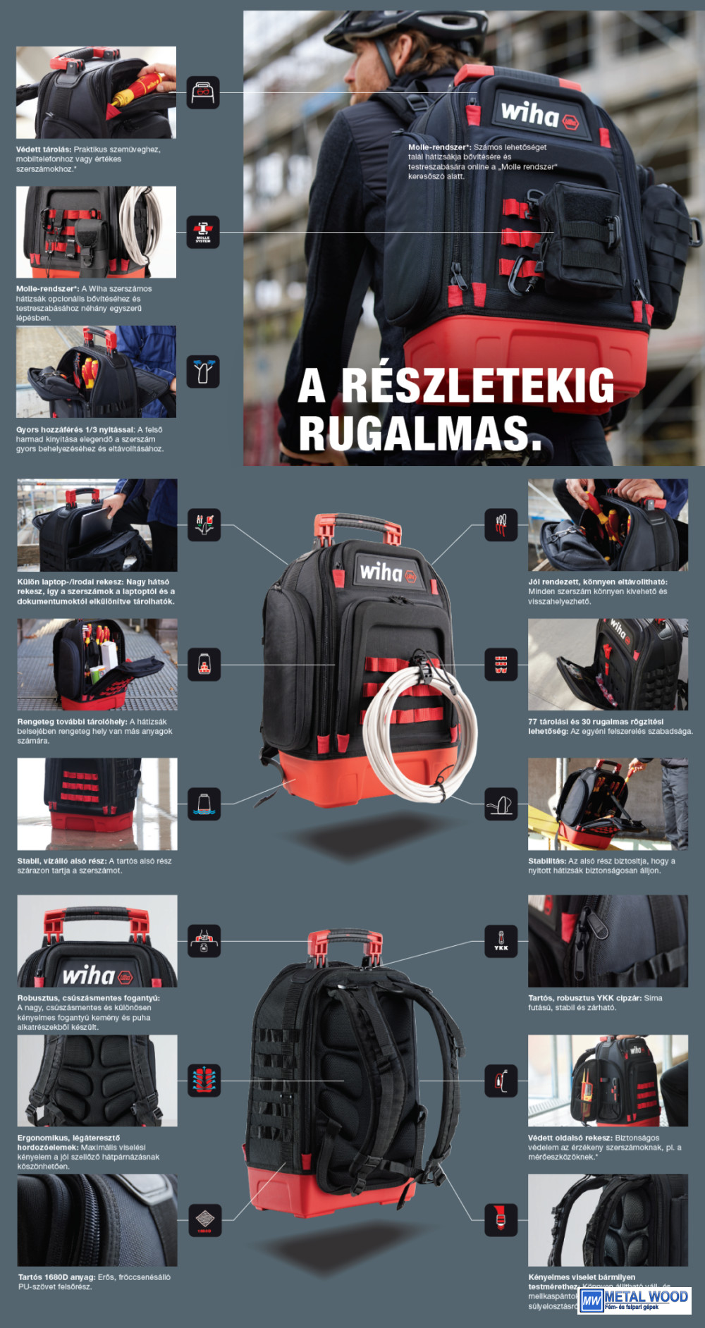 • Molle-rendszer: A Wiha szerszámos hátizsák opcionális bővítéséhez és testreszabásához néhány egyszerű lépésben